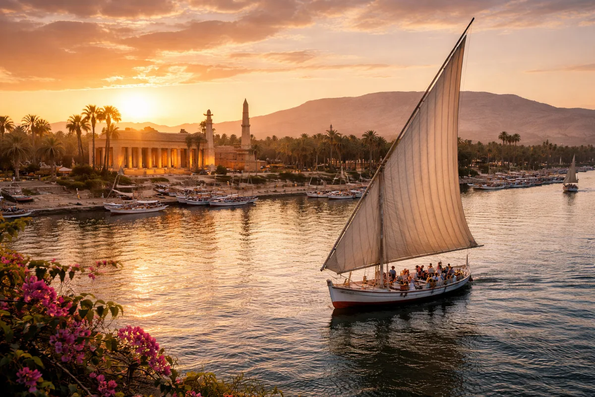 Empieza con un paseo en faluca, la embarcación tradicional del Nilo. Navegar sin motor, en silencio, permite percibir el río como lo hicieron los antiguos egipcios.